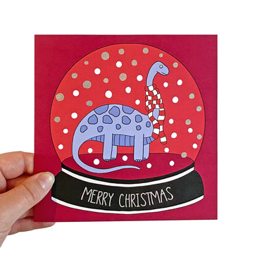 This is a fun, festive Christmas card featuring a dinosaur in a snow globe. This card has been finished with holographic foil for a special touch. This Christmas card is blank inside so that you can send the perfect message.