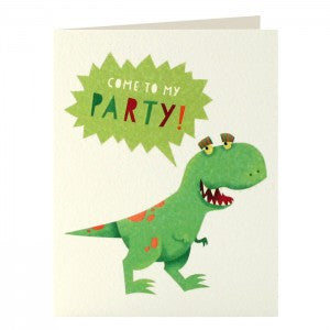 A pack of five high quality notecards illustrated by Julie Fletcher and printed on textured cream board. The image shows a green dinosaur with a green speech bubble and the words ‘Come to my Party!’ inside.