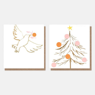 This Caroline Gardner charity pack contains 8 cards consisting of 2 classic Christmas designs, a Dove and a Christmas tree, featuring a selection of metallic foiling or embossed finishes and supplied in boxed packaging.