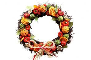 This stunning decoration is available in three different sizes. The circular twig base is decorated with a selection of fragrant dried fruits, cinnamon sticks and pine cones, and scented with ‘Christmas in a Bottle’ oil. It is finished off perfectly with a raffia bow and hanger.