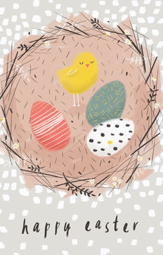 A pack of 6 sweet and cheery Easter cards with yellow envelopes. All 6 cards have the same designs, are blank inside, and printed in the UK on sustainably sourced paper. They have a little added glitter on the eggs and nest to make them even more joyful!