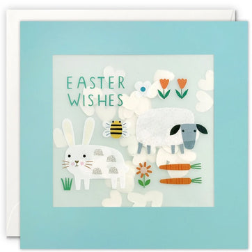 Easter Wishes. A fun day down on the farm is on the front of this paper confetti filled shaky card, perfect for sending who loves to see the new arrivals in Spring. This bright turquoise Easter card is printed on card from sustainable forests, is blank inside and comes with a quality white envelope.