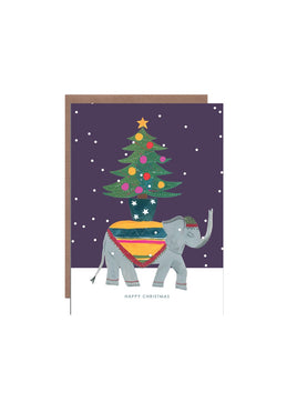 A whimsical Christmas card featuring an illustration of a Christmas elephant. This card has been left blank inside for a personal message and it comes with a brown envelope.