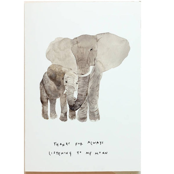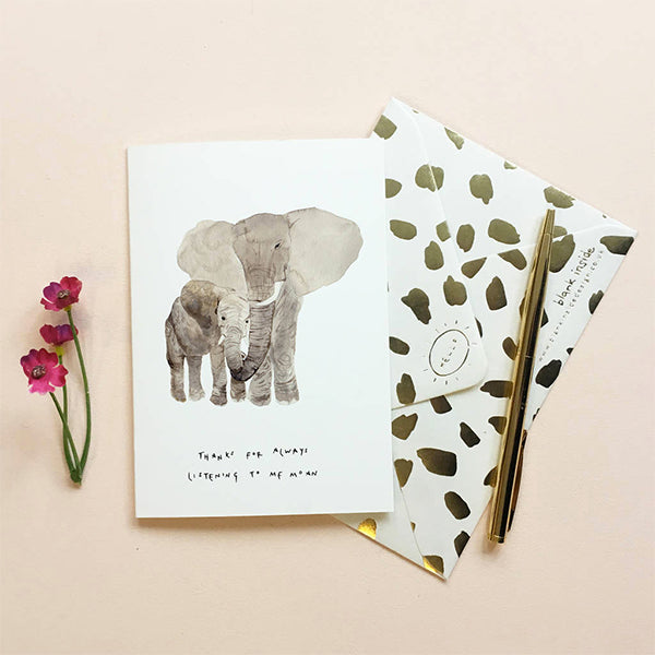 Thanks for always listen to me moan Mother's Day eco friendly card. This mother's day card is blank inside, printed onto ecological ‘tree free’ annually renewable plant fibre cream paper and comes with a gold foiled envelope, made from upcycled coffee cups.