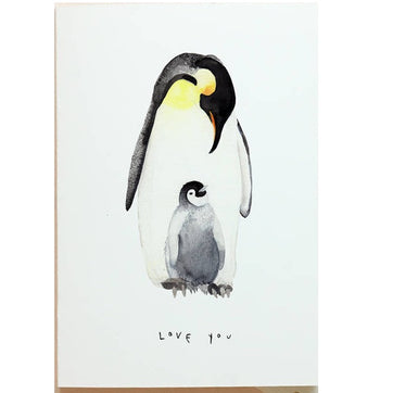 Love You Penguin Mother's Day eco friendly card. This mother's day card is blank inside, printed onto ecological ‘tree free’ annually renewable plant fibre cream paper and comes with a gold foiled envelope, made from upcycled coffee cups.