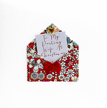 For your darling wife, you need a darling card! This handmade card features a lovely fabric envelope with a scripted message and extra ribbon detail. It has been left blank inside for your own message, and comes with an envelope for safe keeping or sending.