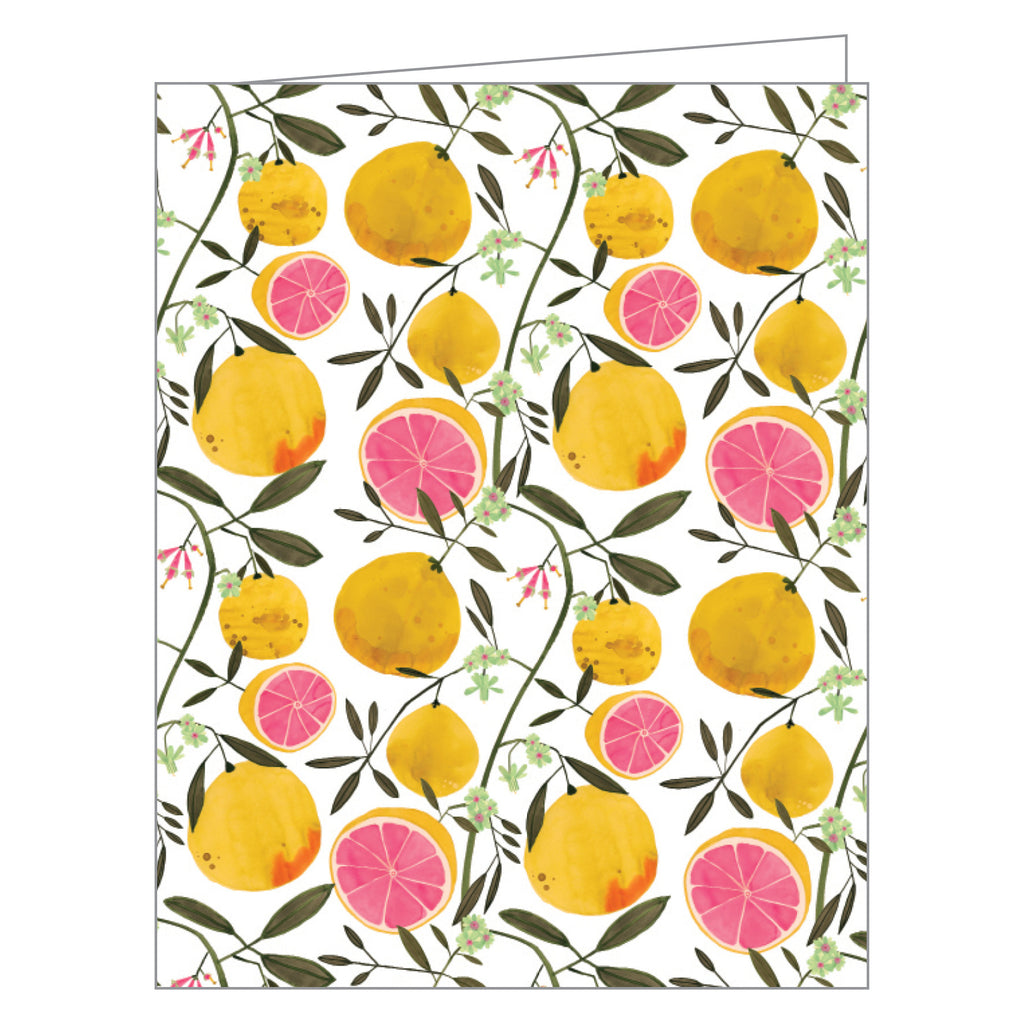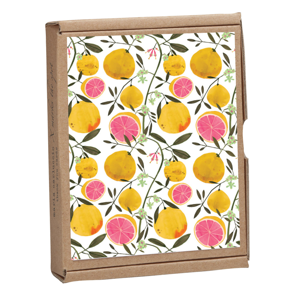 The Farmer's Market GreenNotes boxed notecard set with a pattern of summery grapefruit and flowers illustrated by Anisa Makhoul are happy notes for any occasion. Each reusable, fun corrugated box contains 16 notecards & envelopes, 8 each of 2 images, printed with soy-based inks on environmentally friendly materials. Our GreenNotes focus on function and form with vibrant, full-color artwork. Cards are printed on uncoated paper stock, bundled together with a decorative twine tie.