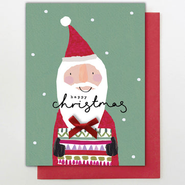Happy Christmas. This smiling santa holds a present which is hand finished with a red bow. This christmas card is blank inside, printed on luxury card and comes with a red envelope.