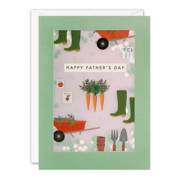 This card is 100% recyclable and is printed and hand finished in the UK. The paper is made from wood pulp sourced from sustainable forests. The image on the front features a gardening theme including carrots, wheelbarrows and wellington boots and is printed on translucent paper, showing coloured confetti dots behind.