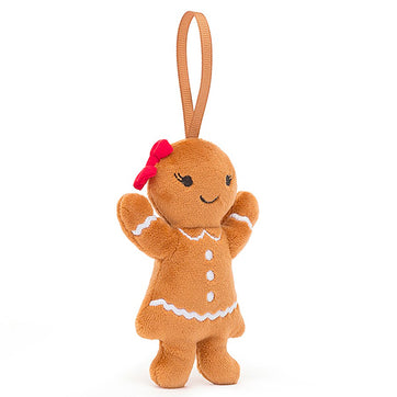 Making the perfect pair with Festive Folly Gingerbread Fred, Ruby is a gorgeous gal, smiling and ready to hang from your Christmas tree. Nutmeg hues of soft caramely brown cover her little squidgy body and generous lashings of crisp white icing are delightfully complimented by her ruby red bow.
