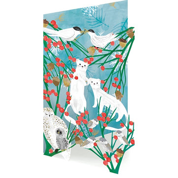 This festive scene of minks, owls, birds and berries is from Katie Vernon and is a great way to send bright and cheery Christmas greetings. This lasercut Chrismtas card is blank inside and comes with a quality envelope.