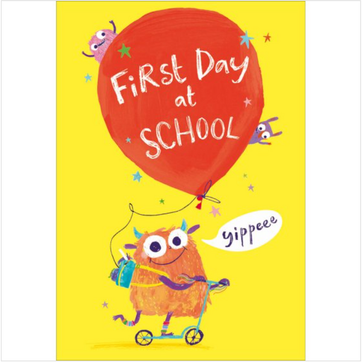 This card is perfect for the cheeky monster you know on their first day of school. The card shows an adorable orange monster scooting along with a large smile saying "yippeee" as they roll along. With a bright and bold sunshine yellow background and mini monster friend, it's the perfect card to put a smile on any little one's face.