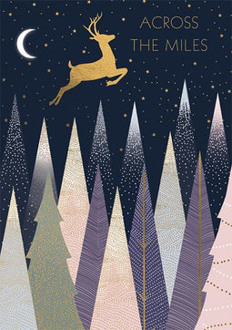 Send a holiday message across the miles with this gold foiled card featuring a stunning gold reindeer flying across the winter forest. The family Christmas card has been left blank inside for your own message and comes with an envelope ready for sending.