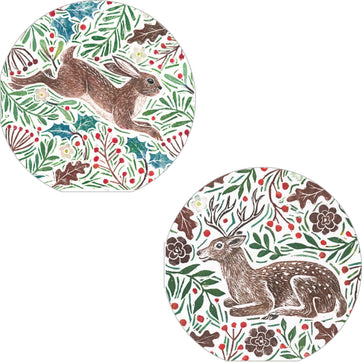 Two circular card designs complete this card pack of 10, one with a deer and the other with a hare bounding through decorative foliage, a perfect card set to send during the holidays.