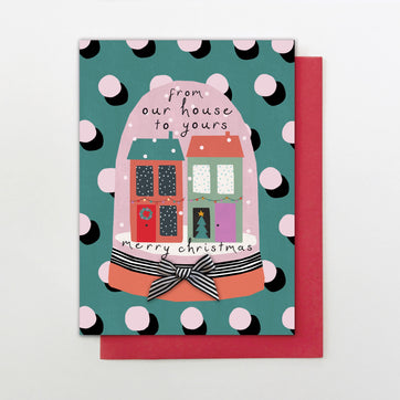 Wish that special household a very merry Christmas with this lovely card of two houses in a snowglobe. Printed on luxurious board, this card is embellished with a black and white stripy bow for added fun. Cello wrapped, it comes with a bright red envelope.