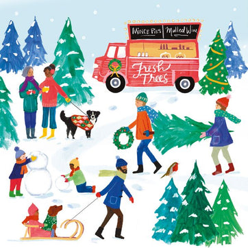With bright, bold colours, this joyful illustration of a cheerful group celebrating winter's festivities, these cards are a great choice to spread season's greetings.