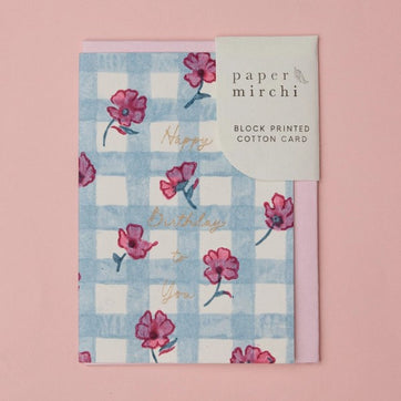 A playful block-printed birthday card, hand crafted in small batches by skilled artisans. Featuring a charming mix of blue gingham and pink flowers, it’s a cheerful and stylish way to wish someone a happy birthday.