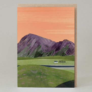 The serene image of a small boothy tucked between fields of heather and mountains under a pink sky makes for the perfect card for any occasion.