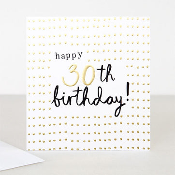 Gold 30th Birthday Card. This birthday card is blank inside, printed on low chlorine pulp board from sustainable forests and comes with a 120g white envelope.