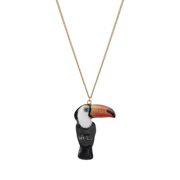 A bold and beautiful hand painted porcelain toucan sits proudly around your neck, showing off his bright bill. He comes on a 24"/28" gold extendable chain.