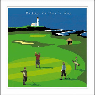 This lovely Father's Day card features a bright illustration of a golf course - ideal for a golfer dad! Inside the message reads 'Have a wonderful day'.