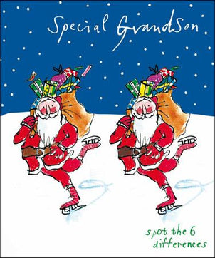 Send this Christmas card to your special grandson. It features an illustration by Quentin Blake. This card has been finished with glitter and comes with a white envelope.