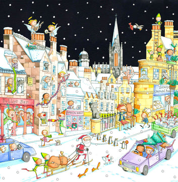A snowbound Greyfriar's Bobby sits in the heart of Edinburgh surrounded by the hustle and bustle of an Edinburgh Christmas. Each Chrismtas card is blank inside and comes with their own quality envelope.