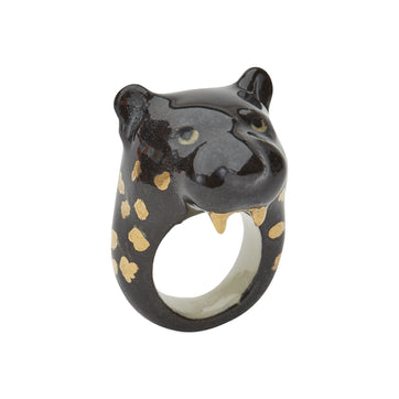 Hand painted roaring panther ring, complete with shiny gold leaf teeth. He's 100% porcelain and should be treated as fragile. This panther comes is a M/L size, which is an O/P is standard ring sizes.