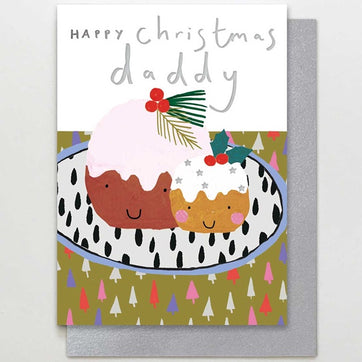 Happy Christmas Daddy. Two cosy Christmas puds make the perfect way to let Dad know that you care. This silver foil Christmas card is blank inside, printed on forest friendly paper and comes with a bright and shiny silver envelope.