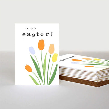 This coulourful tulip filled Easter card is perfect to brighten up someone's Easter morning. Each card is blank inside, printed on low chlorine pulp from sustainable forests, can be recycled and comes with a set of quality white envelopes.