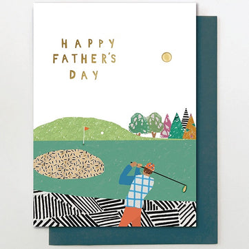 For dads who love to gold, this is the perfect Father's Day card! It reads 'Happy Father's Day' in gold text alongside a colourful golf course illustration. Blank inside.