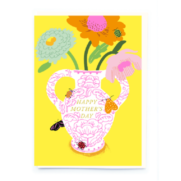 Send your love and appreciation to your mum this Mother's day with this embossed gold foil card with a funky illustration of bee-utiful vase of bees, butterflies and flowers.