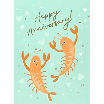 Happy Anniversary. These gold foil dancing lobsters say it all. This anniversary card is blank inside, is printed on 100% recycled card using vegetable inks and comes with an envelope.