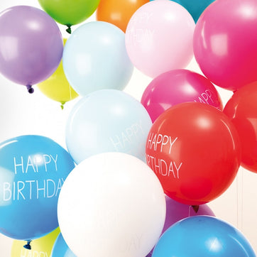 Happy Birthday Print Pack of 12 Balloons made of natural rubber latex. They are 30cm in size. This mix of brightly coloured balloons have Happy Birthday printed on them.