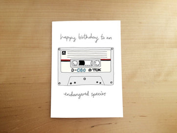 This quirky birthday card reads 'happy birthday to an endangered species' alongside an illustration of a cassette tape. Blank inside for your own message.