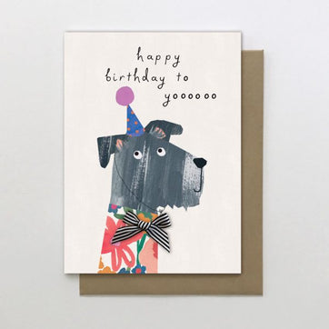 Send some birthday love with this sweet card of a dog in a party hat and a hand embellished bow tie.