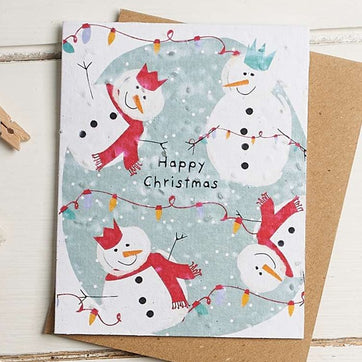 Happy Christmas. Four cheeky snowmen are tangled up in fairy lights on this plantable card that is also a gift. This Christmas card is printed on Carrot seed paper so you can plant it and grow carrots, is blank inside and comes with a quality Kraft envelope.