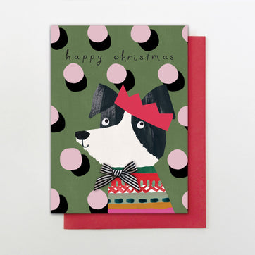Wish the dog lover in your life Happy Christmas with this dotty card of a party hat wearing dog. Printed on luxurious board, this card is embellished with a black and white stripy bow for added fun. Cello wrapped, it comes with a bright red envelope.