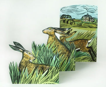 Artists Angela Harding creates another beautiful die-cut card, blank to send as you wish. This 3-D fold out card features a scen of hares in an open field with a lovely house behind them, in vibrant shades of green and blue.