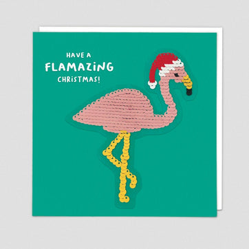 This playful Christmas card comes with a removable festive flamingo sequin patch - a festive card and glittery gift in one!