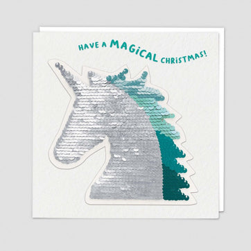 This bright Christmas card comes with a removable unicorn sequin patch - a festive card and glittery gift in one!