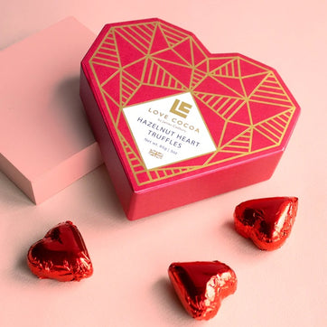 Perfect for sharing on Valentine's Day, these delicious red foil wrapped hazelnut praline-filled milk chocolate heart truffles come in a stunning red heart shaped box.