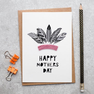 Happy Mother's Day. This tribal feather headdress design is the perfect wya to crown your mum queen for a day. This mothers day card is blank inside, printed on GF Smith card and comes with a Kraft envelope.