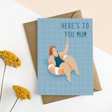 If your Mum deserves a holiday then this fun and quirky illustration card is sure to transport her to a sunny space. Make your Mum smile with this pool floatie design.