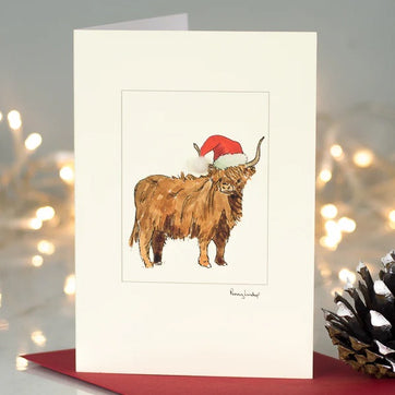 A highland cow is ready for Christmas with its sheep's wool finished Santa hat. This Christmas card is blank inside, is printed on quality 300 gsm textured card and comes with a quality scarlet envelope.