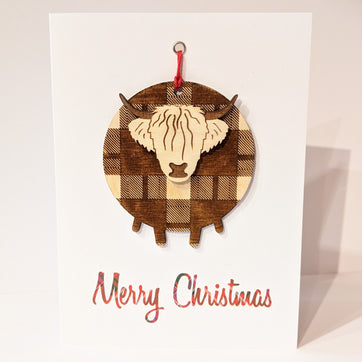 This delightful hand-made Christmas card doubles as an ornament! This design features a wooden highland cow bauble with a dark tartan pattern.