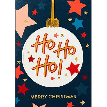 Ho Ho Ho. This fresh and funky festive card is also a gift as the recipient can pop out the bauble and hang it on their tree. This die cut Christmas card is blank inside, is printed on luxury card and comes with a satin ribbon and a quality envelope.