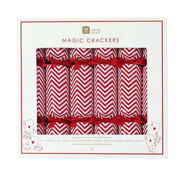 These festive red and white crackers come in a pack of 6 and each measure at 10 inches long. With 6 different magic tricks, entertainment scroll, jokes, tongue twisters, trivia questions, and a fetching paper hat, these are sure to be a cracking addition to the Christmas table!