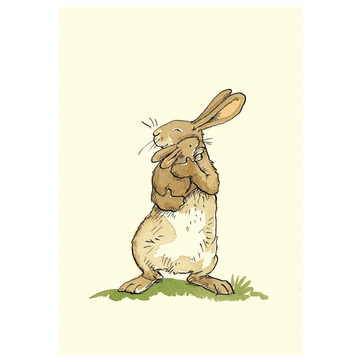 The sweet card from Anita Jeram, a celebated children's book illustrator, features a mummy hare cuddling her infant.