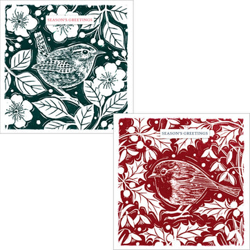 Two bold card designs complete this card pack of 10, each with a bird and the other with a bird in either a red or green festive scene.